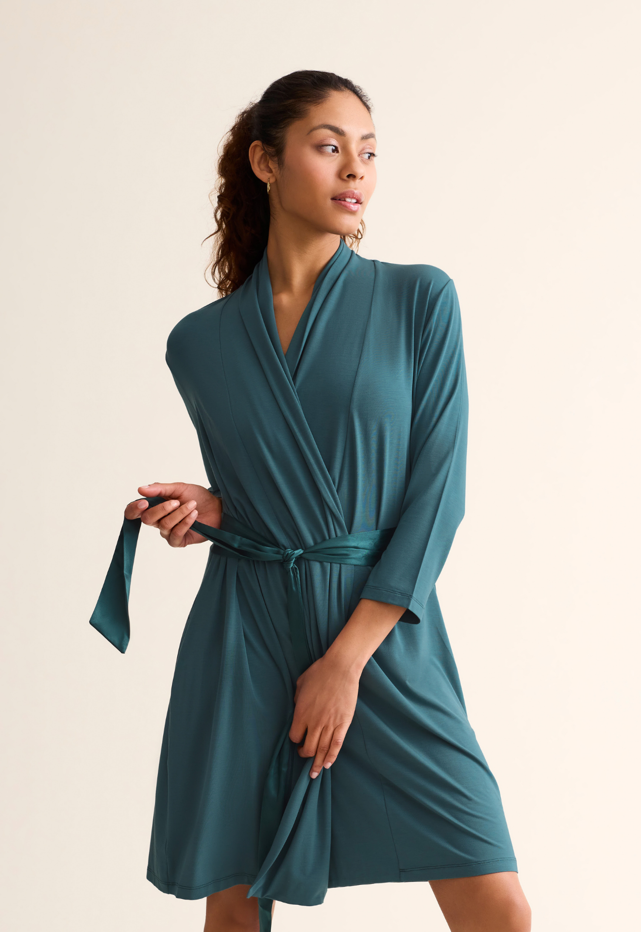 Made from cloud-soft, eco-friendly fabric, this robe is perfect for peaceful mornings, relaxing afternoons, and cozy evenings. With luxurious satin ties, convenient pockets, and a flattering ruched waist, itâs an instant upgrade to any loungewear collection.